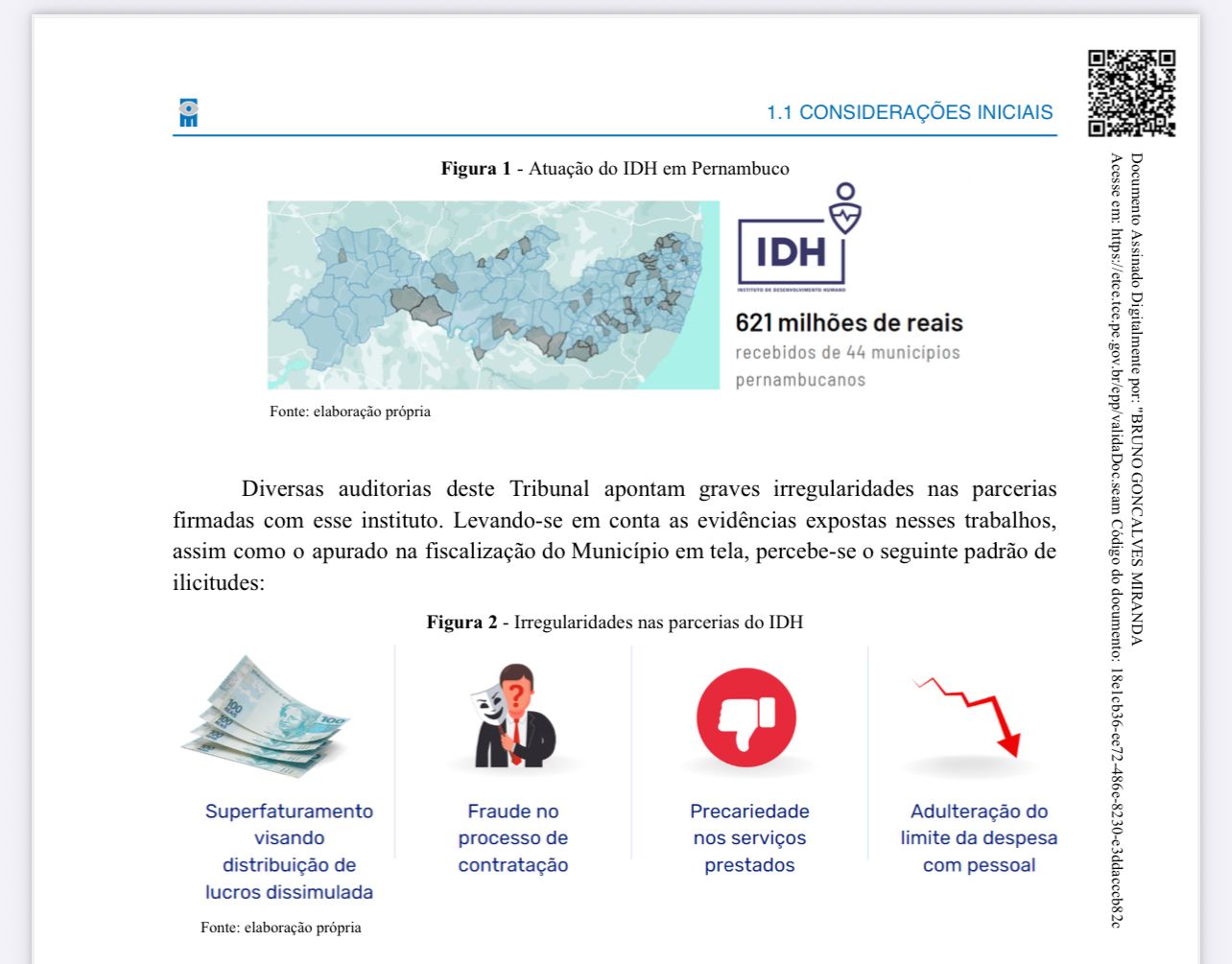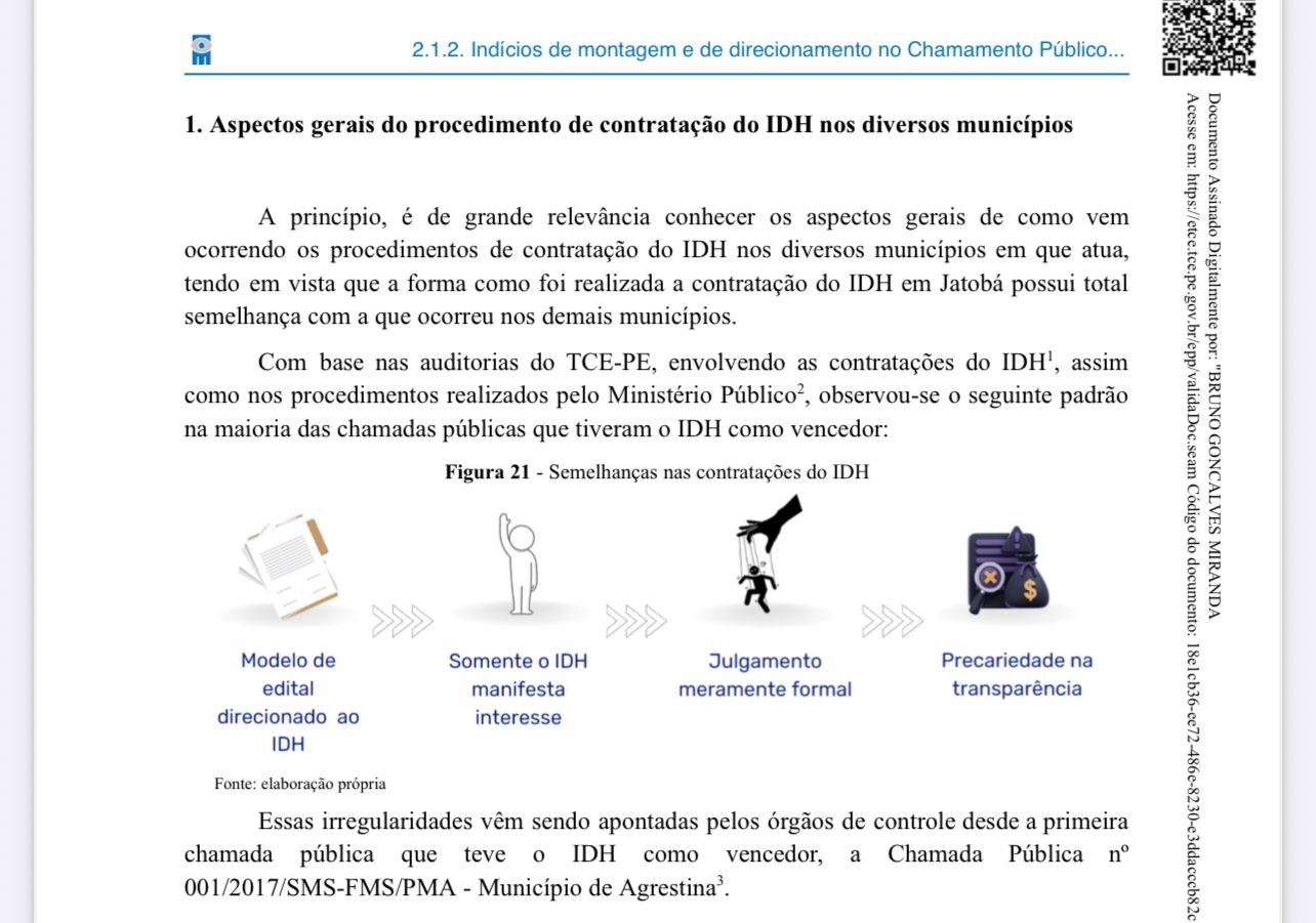 As irregularidades observadas em Jatobá seguem o mesmo modus operandi identificado em auditorias realizadas em diversos municípios pernambucanos que também contrataram o IDH: