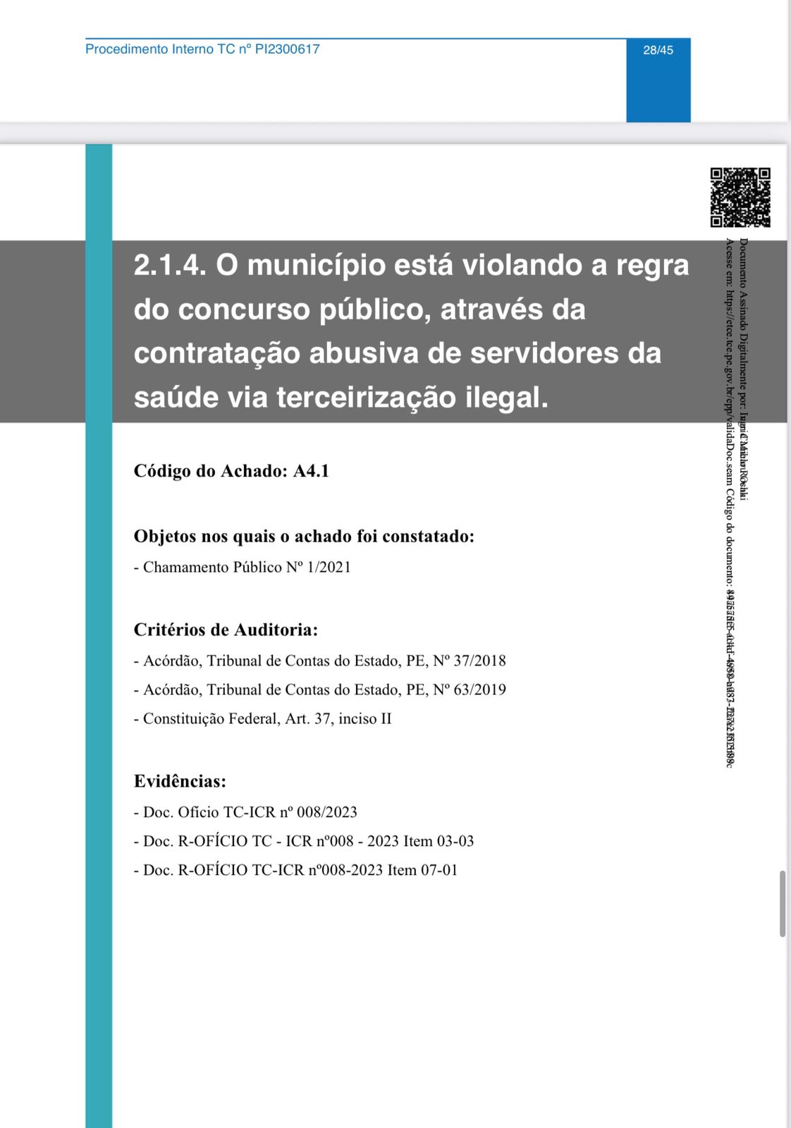No processo nº 23100562-0, que resultou no Acórdão TC n.º 700648/23, aprovado pela Segunda Câmara da Corte de Contas, o TCE-PE impôs multa ao gestor municipal por manter modelo de contratação temporária considerado ilegal, que para o tribunal feriu princípios constitucionais da administração pública.